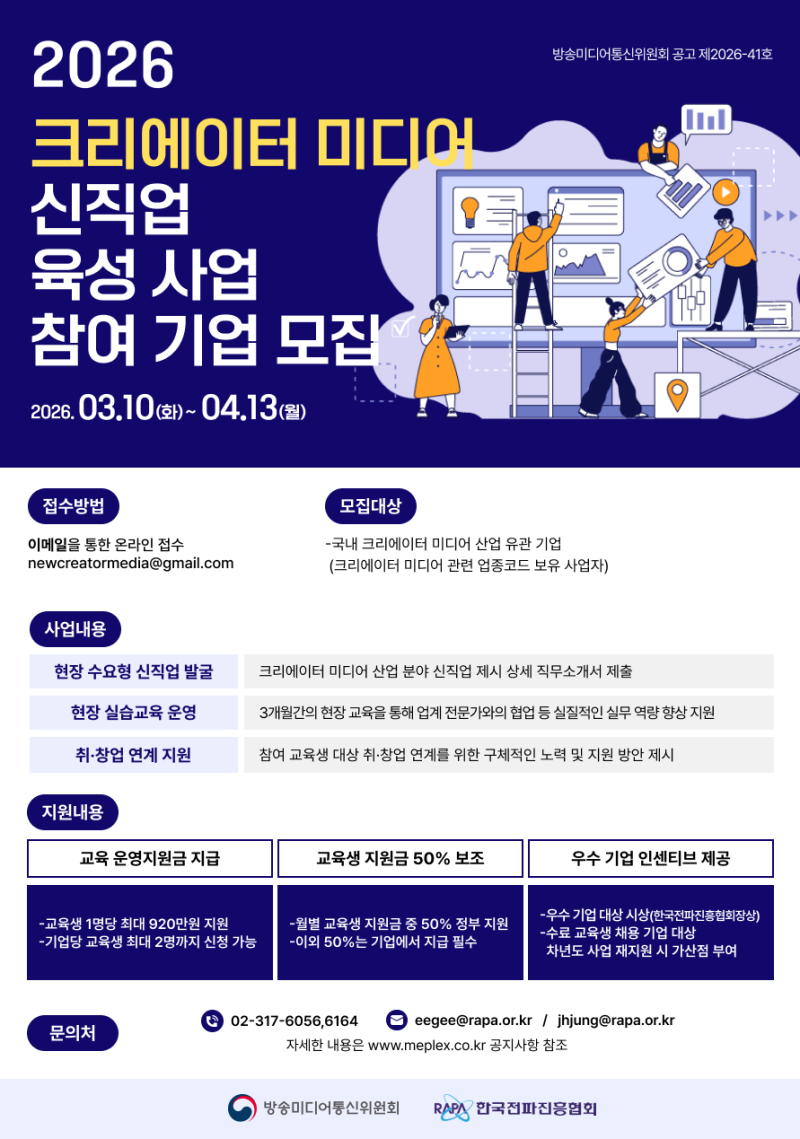 「2026년도 크리에이터 미디어 신직업 육성 사업」에 참여할 기업을 아래와 같이 모집합니다. 모집에 관한 자세한 내용은 첨부파일 내 공고문을 참고해주시기 바랍니다.